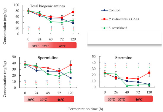 Trends of total biogenic amines, spermidine and spermine in the batches inoculated with P. kudriavzevii ECA33 (red line), with S. cerevisiae 4 (green line), and in uninoculated control (blue line). Data are expressed as mean ± standard deviation (SD) values from duplicate determinations. * Different letters in the same column (hour) indicate significant differences (p < 0.05) among inoculated strains; first row control, second row P. kudriavzevii ECA33, and third row S. cerevisiae 4.