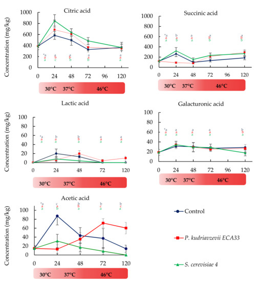 Citric acid, succinic acid, lactic acid, galacturonic acid, and acetic acid production during fermentation of P. kudriavzevii ECA33 (red line), S. cerevisiae 4 (green line) and uninoculated control (blue line). Data are expressed as mean ± standard deviation (SD) values from duplicate determinations. * Different letters in the same column (hour) indicate significant differences (p < 0.05) among inoculated strains; first row control, second row P. kudriavzevii ECA33, and third row S. cerevisiae 4.
