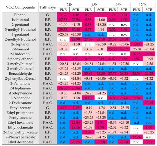 Combination of charts showing altered volatile organic compounds (VOCs) and addressed microbiota metabolic pathways, where numbers inside boxes display the base 2 logarithms of fold-change calculated with respect to the response in uninoculated samples; blue color (n.d.) = not detected during fermentation in all batches; white color (n.v.) = no variation with respect to control; red color (+) = increase after addition of the strains; pink color (−) = decrease after addition of the strains. Pathways: F.A.O.: Fatty Acids Oxidation. G.: Glycolysis. E.P.: Ehrlich Pathway.
