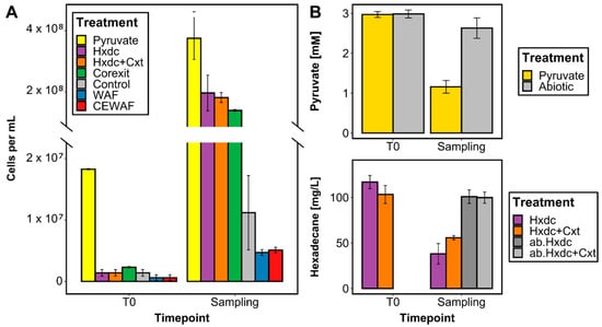 Growth and biodegradation of carbon sources supplied to Marinobacter sp. TT1 cultures, sampled for proteomic analysis after 1 day (pyruvate treatments) or 4 days (all other treatments) of incubation. Treatments contained the following carbon sources: 3 mM pyruvate (Pyruvate), 100 mg L−1 n-hexadecane (Hxdc), 100 mg L−1 n-hexadecane and 10 mg L−1 Corexit (Hxdc+Cxt), 100 mg L−1 Corexit (Corexit), no carbon source (Control), 6 mg L−1 water-accommodated fraction (WAF)-derived dissolved organic carbon (DOC) (WAF) or 6 mg L−1 chemically-enhanced WAF (CEWAF)-derived DOC (CEWAF). Results shown are averages of sacrificial, triplicate cultures (standard deviations are based on triplicates). ab. = abiotic controls without inoculum. (A) Cell numbers determined by fluorescence microscopy are presented using a divided y-axis in order to better visualize the lower cell numbers in WAF and CEWAF treatments. (B) Remaining pyruvate and n-hexadecane concentrations were determined via HPLC or GC-MS measurements, respectively.