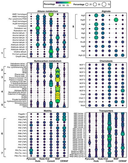 Normalized, relative mean abundances (symbolized by circle size and color; sum per protein = 100%) of a selection of significantly (q-value < 0.05) differentially abundant proteins associated with alkane metabolism, alginate synthesis, non-alkane hydrocarbon (HC) metabolism, chemotaxis, motility, and transmembrane transport systems during growth of Marinobacter sp. TT1 cultures on different carbon sources. Treatments received either pyruvate, n-hexadecane (Hxdc), n-hexadecane and Corexit (Hxdc+Cxt), only Corexit (Corexit), crude oil WAF, or chemically enhanced WAF (CEWAF). 1 = proteins belonging to the proposed alk operon (plus AlkB1 homologue); 2 = Cycloaliphatic HC metabolism; 3 = Phenol metabolism; 4 = Aromatic HC metabolism; 5 = Aminobenzoate metabolism; 6 = Type IV pilus assembly; 7 = Twitching motility; 8 = Proteins belonging to the proposed alg operon. See Table S9 for protein names.