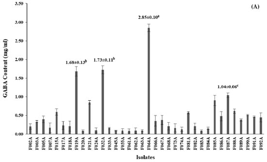 For quantitative analysis of the selected GABA-producing LAB performed by HPLC, GABA contents of all 36 isolates were produced in the range of 0.08–2.85 mg/mL (Table S1). Among 36 isolates, 4 isolates designed as F019A, F032A, F064A and F087A had GABA content higher than 1.00 mg/mL, however, the isolated F064A significantly (p ≤ 0.05) produced higher GABA content at 2.85 ± 0.10 mg/mL than the other isolates. GABA contents of all isolates are shown in Figure 2.