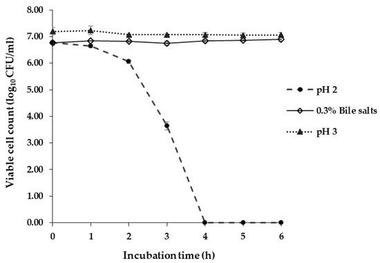 Viable cell count (log10 colony-forming units (CFU)/mL) of L. brevis F064A against acidic condition (pH 2.0 and pH 3.0) and 0.3% (w/v) of bile salts. The experiments were triplicate. The results represented as mean ± S.D. (n = 3).