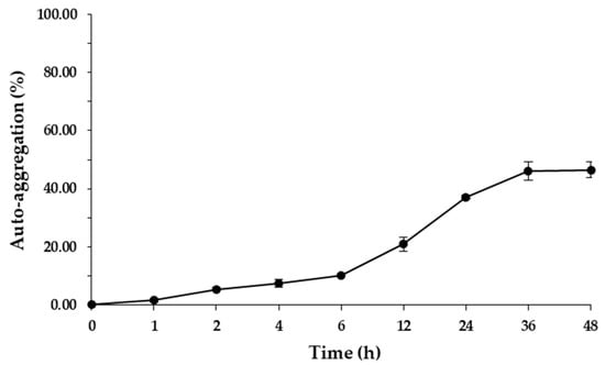 Percentage of auto aggregation ability of L. brevis F064A during 48 h of incubation. The results represented as mean ± S.D. (n = 3).