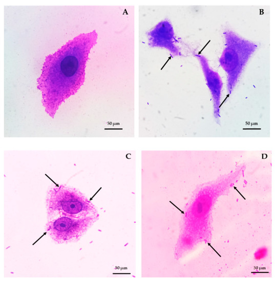 Vero cell control (A). Bacterial adeshion of L. brevis F064A (B), E. coli O157:H7 DMST 12743 (C) and Shigella dysenteriae DMST 1511 (D).
