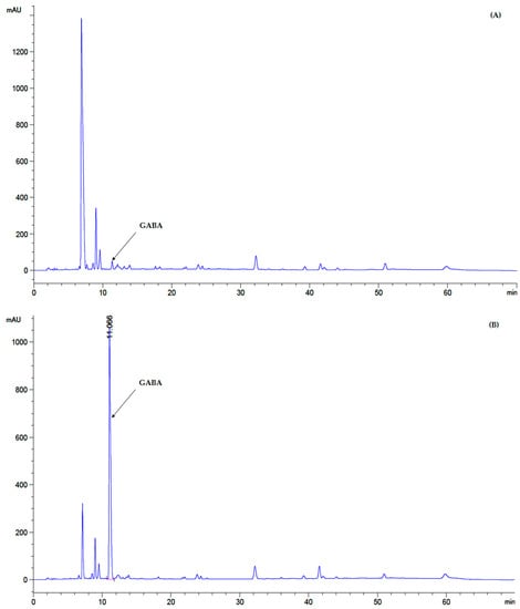 Chromatogram of GABA analysis of GABA-FMJ at 0 h (A) and 48 h (B) of incubation.