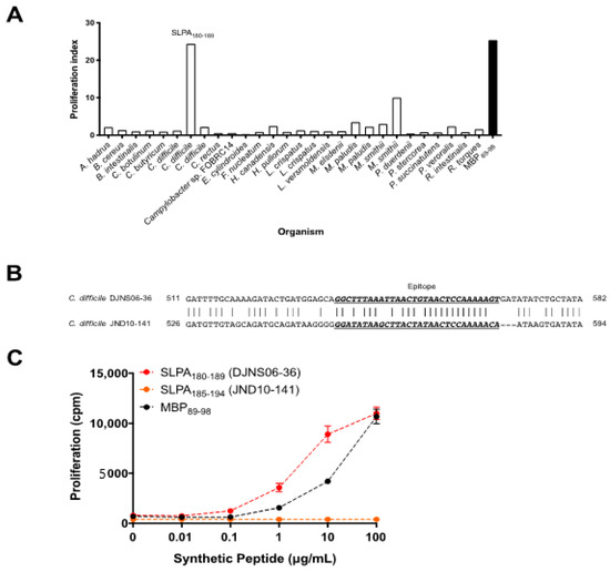 Notably, SLPA is an adhesion protein expressed by C. difficile that mediates binding and adherence to extracellular matrix proteins and gastrointestinal tissues [30,31,32]. It is composed of a conserved high-molecular-weight subunit and low-molecular-weight subunit, the latter of which is diverse among C. difficile strains [33,34,35,36]. As shown in Figure 1B, the DNA sequence of SLPA is different between C. difficile DJNS06-36 and C. difficile JND10-141. As a result, the amino acid sequence of the SLPA mimicry epitope is different (Table 2). While the C. difficile DJNS06-36 genome encodes for the SLPA180-189 peptide (GFKLTVTPKS) according to NCBI Microbial Protein Database, the C. difficile JND10-141 genome encodes for SLPA185-194 peptide (GYKLTITPKT). To test whether the proliferative response is restricted to synthetic C. difficile DJNS06-36 SLPA180-189 peptide, we evaluated cellular proliferation in response to both of the SLPA peptide epitopes. Indeed, MBP89-98-specific T cells proliferated in response to synthetic C. difficile DJNS06-36 SLPA180-189 peptide; however, synthetic C. difficile JND10-141 SLPA185-194 did not trigger a proliferative response (Figure 1C). This data indicates that the HLA-DR2a-restricted myelin-reactive T cell response is specific to SLPA expressed in a certain strain of C. difficile.