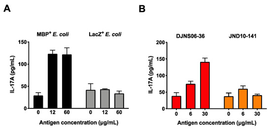 Production of IL-17A in MBP-specific Th17 cells in response to C. difficile DJNS06-36. MBP-specific Th17 cells were cultured with DR2a+ DCs pulsed with cell extract of either (A) MBP+ E. coli and LacZ+ E.coli or (B) C. difficile DJNS06-36 and C. difficile JND10-141, and the production of IL-17A was examined. Data from one representative experiment of two independent experiments are presented.
