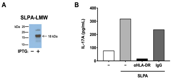 SLPA produced by C. difficile DJNS06-36 can be processed and presented to DR2a-restricted MBP89-98-specific T cells. (A) Purification of LMW-SLPA from BL21 Star™ (DE3) E. coli that expresses LMW-SLPA DNA isolated from C. difficile DJNS06-36. His(6X)-tagged LMW-SLPA protein was induced by IPTG. (B) Memory T cells isolated from MBP-TCR/DR2a Tg mice were cultured with the purified LMW-SLPA in the presence of anti-HLA-DR mAb or isotype control IgG. IL-17A production in response to LMW-SLPA in the context of DR2a was examined. Data from one representative experiment of two independent experiments is presented.