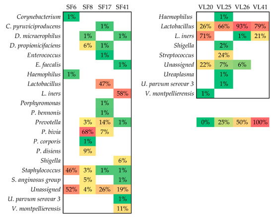 Microbial profile of HPV-positive seminal fluids (SF) and vaginal lavages (VL); the relative abundances of the bacteria identified in HPV-positive samples.