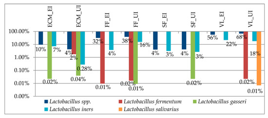 Among the Lactobacillus species, the predominant species identified in the study cohort was L. iners, which corresponds to the vaginal community state type (CST) III [31]. A low amount of L. gasseri was also identified, corresponding to the CST II. The L. iners amount significantly (FDR p value = 0.04) differed among the samples (Figure 3).