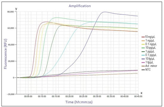 Example of a typical LAMP run in Genie® II. The graph was created in the program Genie Explorer and shows an analytical sensitivity test using the concentrated master mix. The x-axis shows the amplification time (hh:mm:ss), while the y-axis shows the fluorescence expressed in relative fluorescence units (RFU). Red, orange, yellow, green, dark green, blue, dark blue, and pink are the colors used to represent ten-fold serial dilutions of G. (H.) parasuis (DSM 21448) genomic DNA from 10 ng/µL to 1 fg/µL, respectively. The brown curve represents DNA from Actinobacillus minor strain CCUG 38923T (0.1 ng/µL) and the black curve represents the no template control (NTC).