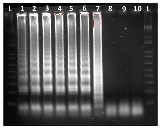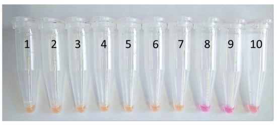 In addition, an assay based on a colorimetric detection reaction was tested. The detection of a color change with the naked eye using a colorimetric master mix and amplification in the heating block resulted in a detection limit of 10 fg/µL, which is the same result as obtained with the Genie® II assay (Figure 3). Even with the colorimetric detection, all negative controls remained visibly negative (shown in pink (samples 8–10)), while the positive samples turned dark yellow (samples 1–7). Gel electrophoresis confirmed results of the colorimetric test and showed a typical band pattern starting at the detection limit of 10 fg/µL DNA and for higher DNA concentrations (Figure 4).