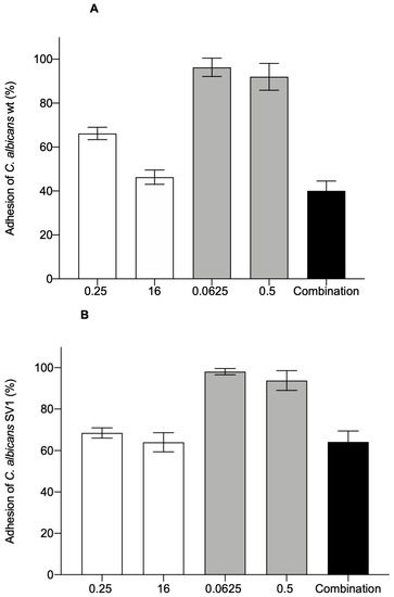 Adhesion of C. albicans wt (A) and SV1 (B) yeasts to the surface of HEK-293 cells. Cells were treated with different concentrations (µg/mL) of CSDP+ (white bars), fluconazole (grey bars), and their combination (0.25 µg/mL of CSDP+ and 0.0625 µg/mL of fluconazole, black bars). Data are shown as mean ± standard deviation (SD). In the absence of any compounds, 100% adhesion was registered.