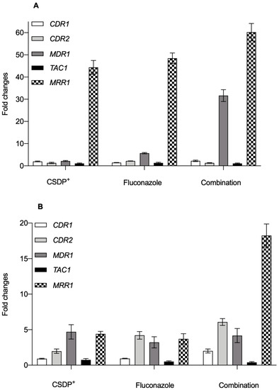 Treatment with CSDP+ in combination with fluconazole resulted in a considerable overexpression of the MDR1 and MRR1 genes in C. albicans wt and clinical isolate strains. These findings suggest that the expression of MDR1 and MRR1 could be associated with fluconazole resistance related efflux, and our next step would be the analysis of fungicidal mechanism of CSDP+ action in a wider range of clinical C. albicans and non-albicans isolates with a different degree of resistance.