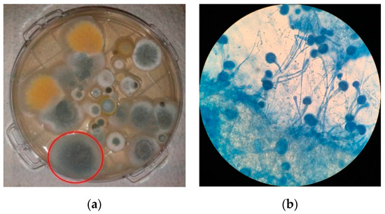 Isolation of Aspergillus from air samples: (a) Example of a culture media plate resulting from the collection of indoor air by impaction, and from where Aspergillus section Fumigati (circled red) was isolated; (b) Example of a microscopic (400×) observation of a lactophenol blue mount of an A. fumigatus isolate.