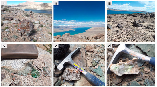 Figure 1. Sampling sites and samples representing the studied groups. (i) Sampling site and (iv) granite collected from the Lake Khargush, (ii) Lake Karakul, and (v) sample representing granite from group B, (iii) sampling site situated near Karakul, and (vi) sample of quartzites from group C.