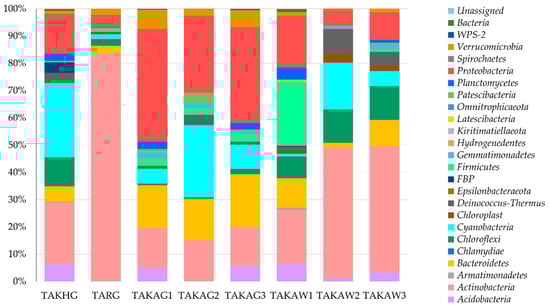 The clustering based on the alpha diversity revealed the presence of two main clusters of communities (Figure S2). Cluster 1 comprises more diverse endolithic communities (TAKAG1, TAKAG3, and TAKAW1), while cluster 2 comprises communities that were identified as less diverse (TAKAG2, TAKW2, and TAKAW3) (Figure S2). These clusters have the outliers in granite from Rangkul (TARG) and granite from Khargush (TAKHG). Communities from the first cluster are characterized by a high contribution of Actinobacteria and a lower percentage of Proteobacteria than the communities in the cluster 2. The second cluster was also characterized by stable contribution of Actinobacteria. The percentage of Cyanobacteria has fluctuated between the communities and was not characteristic of any of the clusters.