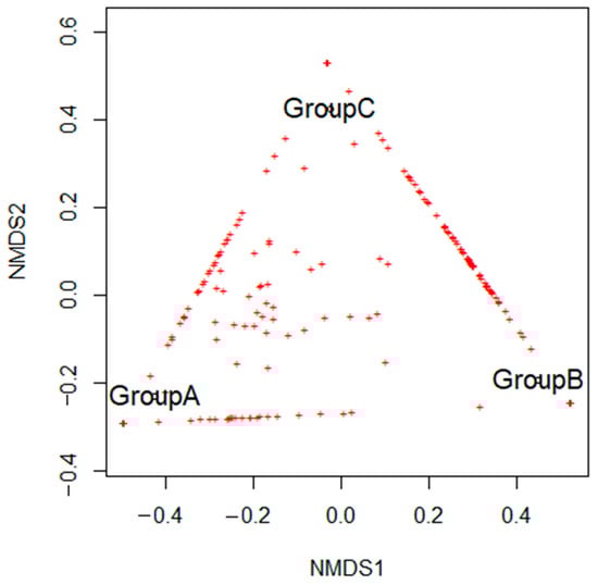 The results of non-metric multidimensional scaling, based on the structure of microbial communities, revealed that endolithic communities from studied groups were sharing only some ASVs, while most of the sequence variants seem to be group-specific. The NMDS plot showed a triangle-like arrangement of the communities’ structures. Thus beta-diversity analysis did not reveal a high resemblance between particular communities. (Figure 4).