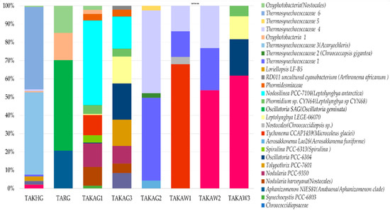 According to the SILVA database, the contribution of the order Synechococcales was high compared to those mainly consisting of species that can fix atmospheric nitrogen, such as Nostocales and Chroococcidiopsidales (Figure 5). The samples which were dominated by Synechococcales (TAKAG2 and TAKHG) (35% and 34% respectively) were also characterized by a greater contribution of order Rhizobiales (5% and 6% respectively) which belongs to Alphaproteobacteria. The Spearman correlation index calculated for the structure of Synechococcales and Rhizobiales is r = 0.76 (p-value = 0.03), however the correlation index was only calculated for eight studied communities here. The community TARG that was characterized by the absence of Synechococcales, but a greater contribution of Oscillatoriales and Nostocales according to the SILVA database contained also only 1% of Rhizobiales.