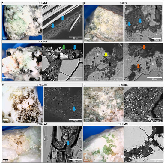 The top view of endolithic biofilms of the broken rocks and cross-sections of studied rock samples. (A) Cyanobacteria-dominated biofilm (TAKAG1 and TAKAG3) with coccoid cyanobacteria forming packets colonized mica (blue arrow) and smaller bacterial cells (green arrow). (B) Cryptoendolithic communities inhabiting quartzites are mainly represented by package-forming coccoid cyanobacteria (blue arrow). (C) Euendolithic community inhabiting Ca-rich layer (Ca), composed of different cyanobacterial morphotypes including coccoid (blue arrows) and filamentous, non-heterocystous cyanobacteria (brown arrows), and diatoms (yellow arrow). (D) Cross-sections of lichen-dominated biofilms (TAKHG, TAKAW1).