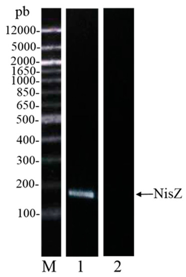 First, we excluded the presence of folded proteins (bacteriolysins) by treating the supernatants of L. lactis 41FLL and L. sakei I151 at 90 °C. This procedure did not affect the inhibitory potential of cell-free supernatants (data not shown) thus supporting evidence for a peptide molecule. Considering that L. lactis is a good nisin producer, the genes for nisin were targeted after PCR in the strain L. lactis 41FLL. As shown in Figure 1, the NisZ band is clearly detectable in agarose gel. The most studied bacteriocin produced by LAB is Nisin A, which has been approved by the World Health Organization as food preservative. Nisin Z, a natural variant of Nisin A, was firstly isolated from L. lactis ssp. lactis NIZO 22186 by Mulders and co-workers (1991) [55]. Nisin Z differs from Nisin A for the presence of an asparagine instead of a histidine in position 27. This substitution has no effect on the antimicrobial activity, although the increased solubility of Nisin Z at pH 7.0 can offer greater potential applications at neutral pH [56].