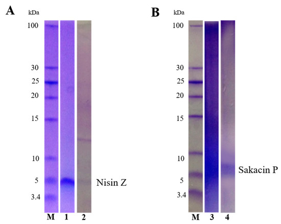 Purified nisin and sakacin were checked by Tricine-SDS-PAGE as described by Schägger (2006) [43] in Mini-PROTEAN Tetra Cell with Mini-Protean Tricine precast gels. Samples were quantified by the Bradford assay [41] and diluted in the sample buffer (12% SDS (w/v), 6% mercaptoethanol (v/v), 30% glycerol (w/v), 0.05% Coomassie Blue, 150 mM Tris-HCl pH 7) in order to load into the gels 5 µg of proteins. Molecular weight markers were from PageRuler Low range unstained protein ladder. The gels were stained with colloidal Coomassie Blue [44,45].