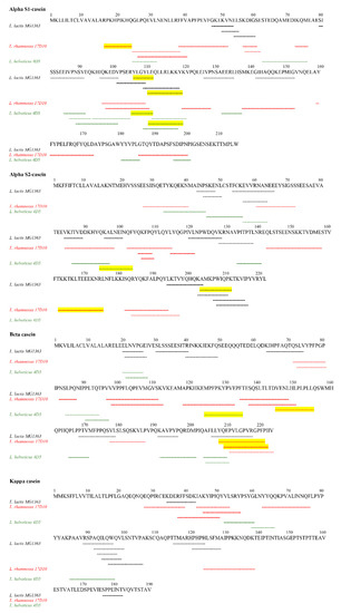 Peptide coverage of the four caseins digested by L. lactis MG1363 (black), L. rhamnosus 17D10 (red) and L. helveticus 4D5 (green). Peptides with established bioactivity are underlined in yellow.