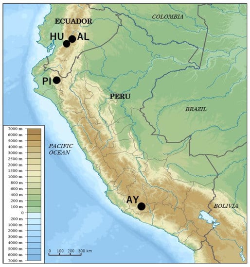 Map of Ecuador and Peru showing geographic locations at which Lutzomyia ayacuchensis were collected. AL, Alausi (2365 m altitude); HU, Huigra (1568 m altitude); PI, Huancabamba, Department of Piura (1938 m altitude); AY, Sancos, Department of Ayacucho (2819 m altitude). (Adapted from a map available at https://commons.wikimedia.org/wiki/File%3APeru_physical_map.svg).