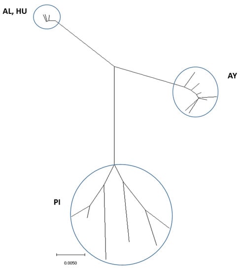Phylogenetic tree of cytochrome oxidase I sequences among Lutzomyia ayacuchensis populations. The scale bar represents 0.005% divergence. AL, Alausi; HU, Huigra; PI, Piura; AY, Ayacucho.
