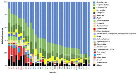 The bacterial diversity of wild-caught populations of Lu. ayacuchensis adults was investigated using high-throughput sequencing of the 16S rRNA gene. To ensure the highest quality sequencing data, 34 (AL: 10, HU: 9, PI: 6, and AY: 9) out of the 59 analyzed female samples were selected and used in the data analysis of the present study. Taxonomic compositions were also compared between the three groups at the genus level. Fifty-nine genera were identified, of which 21 were widely identified and comprised more than 95% of all bacteria. The latter genera were taxonomically assigned to 15 families of 10 orders in 3 classes and 3 phyla, with a few unclassified taxa at different ranks. Among the 21 dominant bacterial genera identified in the sand flies collected (Figure 3), 10 had never been detected in field sand flies (Lawsonella, Rothia, Dietzia, Anaerococcus, Sphingomonas, Peptoniphilus, Rayranella, Finegoldia, Peptostreptococcus, and Altereythrobacter).