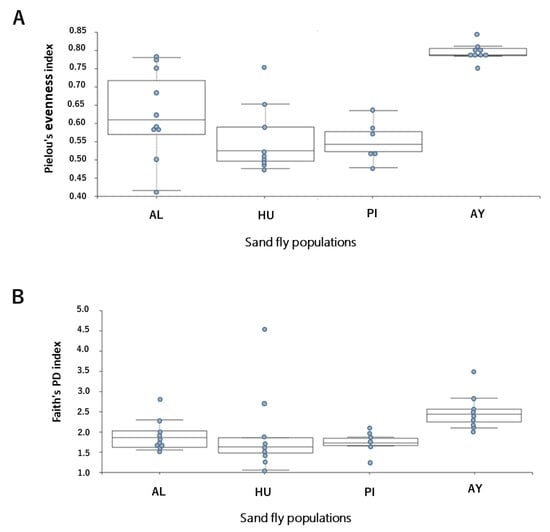 Box plots of the alpha diversity measure using Pielou’s evenness index (A) and Faith’s phylogenetic diversity index (B) in Lutzomyia ayacuchensis populations. Ecuador (AL, Alausi; HU, Huigra); northern Peru (PI, Piura); southern Peru (AY, Ayacucho).