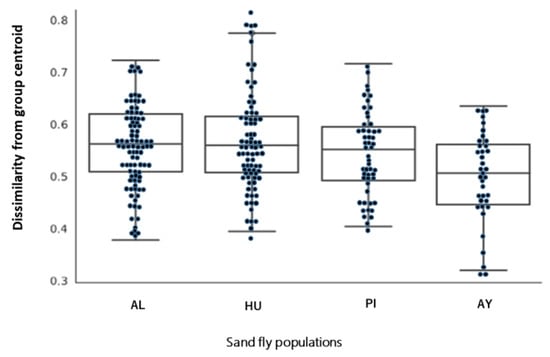 The detailed structure and taxonomy of the microbiome are shown in Figure 3. The alpha diversity index was significantly higher in the southern Peru population (AY) (p < 0.05), which may have been due to exposure to several bacterial sources (Figure 4A,B). Similarly, the components of taxonomic beta diversity showed more complex patterns in the southern Peru population (AY) (p < 0.05) than in the other populations (Figure 5; Figure S1). Each of Ecuador and southern Peru populations comprised individuals of particular genera, while overlap was clearly observed between microbes isolated from different areas, including a number of soil and environmental organisms, such as species of Micrococcus and Corynebacterium. It is also important to note that all sand flies collected from different sites of each population harbored similar microbes, suggesting a strong correlation between the sand fly-microbial association and the environment in which they reside. Two bacterial genera: Clostridium and Peptostreptococcus were only found in the southern Peru population (AY). On the other hand, Altererythrobacter and Wolbachia genera specifically characterized Ecuador populations (HU and AL, respectively). No specific genera were observed in the northern Peru population (PI). Additionally, Corynebacterium and Micrococcus (33.82 and 10.41%, respectively) were slightly more dominant bacterial genera in the southern Peru population (AY), while Ochrobactrum was the most frequently isolated from sand flies collected in the Ecuadorian Andes (61.46 and 67.22% for AL and HU, respectively) and northern Peru sites (PI, 66.16%) (Figure 3). As shown in Figure 3 and Figure S1, the microbial communities from Ecuador (AL, HU) and northern Peru (PI) were close to each other, while those from southern Peru (AY) were distant.