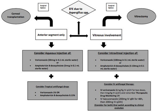EXFE due to Aspergillus spp. may theoretically present with proteiform clinical features, with delayed diagnosis and risk of poor visual outcomes. Moreover, medical treatment has several limitations both in empirical and target therapy. Empirical coverage collides with scarce data and low-quality evidence on antifungal penetration and dosage in local and systemic therapy for EXFE. In Figure 2 we provide shared practical guidelines to simplify clinical decision making (Figure 2). On the other hand, target therapy is not always possible for high rates of negative-culture endophthalmitis and lack of fungal susceptibility testing. In our opinion, strict cooperation between clinical microbiologists, infectious diseases specialists and ophthalmologists in this process may allow the best practices to be optimized, highlighting main steps for a rapid diagnosis and management. This review may pave the way for larger studies to improve the clinical management of exogenous fungal endophthalmitis.