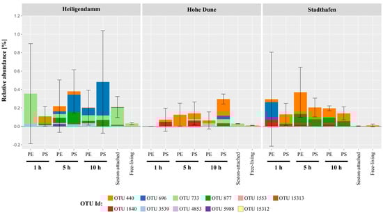 Mean relative abundance data of Vibrio operational taxonomic units (OTUs) on PE, PS, and water during an in situ incubation experiment covering the Warnow river (Stadthafen) and two Baltic Sea coastal station (Heiligendamm and Hohe Dune). Plastic samples were taken after 1, 5, and 10 h. Vibrio abundances within the water were fractionated into those on the seston-attached fraction (>3 µm) and in the free-living fraction (3–0.22 µm). Colors indicate different Vibrio OTUs based on 97% sequence similarity. Error bars give the standard deviation (SD) of the mean aggregated Vibrio abundances.