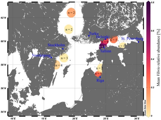Mean relative abundance data of Vibrio spp. on field sampled plastics of the POS488 summer cruise (2015), covering the Gotland Sea (ex. Bay of Gdansk), Gulf of Riga, Gulf of Finland, and Bothnian Sea. Color gradient depicts mean Vibrio abundance (%) (in the case of n = 1, no mean was calculated), n = number of microplastic particles. Blue diamonds show major cities (>100,000 inhabitants) around the sampling area. The map was constructed using Ocean Data View v. 5.0.0 [].