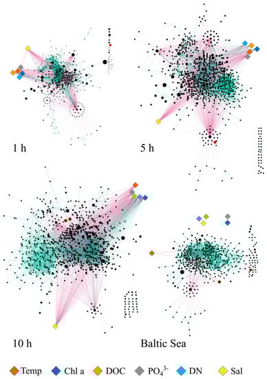 Co-occurrence networks were constructed for each timepoint from the in situ incubations, including both PE and PS samples as well as from all plastic samples collected in the Gulf of Finland. For all networks, only OTUs that were present with a relative abundance > 0.01% in at least three samples were used. Networks were constructed using the CoNet application within the Cytoscape program [], as described in Faust and Raes (2016) [], including environmental parameters. Because some were strongly correlated, only the following parameters were included in the networks: salinity, temperature, PO43−, chlorophyll a, dissolved organic carbon (DOC), and dissolved nitrogen (DN). Resulting networks were visualized using the yFiles Organic layout within Cytoscape and analyzed with the NetworkAnalyzer tool.