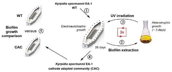 Scheme of UV-assisted cathodic adaptation experiment. (1) Cultivation of K. spormannii EA-1 wild type (WT) in the flow cells under electroautotrophic growth conditions. (2) Biofilm extraction and heterotrophic cultivation. (3) UV irradiation of the inoculum and transfer to the next flow cell cultivation. Steps 2 and 3 were repeated three times in total. (4) Extraction of the cathode adapted community (CAC). (5) Comparison of the WT and CAC in terms of electroautotrophic biofilm growth.