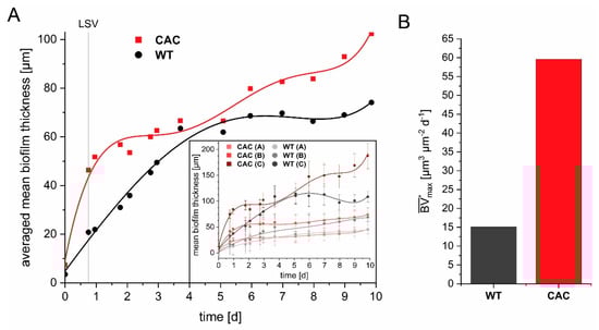 Course of the determined averaged mean biofilm thickness (A) and the maximum biofilm accumulation rates of CAC and WT (B) during flow cell cultivation. The inset in A depicts the mean biofilm thickness including standard deviations for the individual measuring points A, B, and C, located in the front, middle and back part of the cathode. The data points were fitted using a polynomial fit of 5th order with R2 > 0.96. was determined as described in []. The time point of the linear sweep voltammetry (LSV) end is marked.