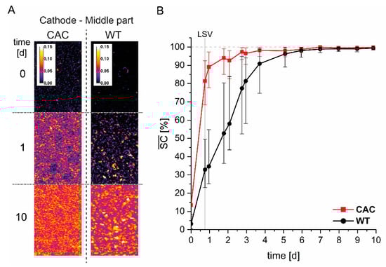 Macroscopic evaluation of the K. spormannii biofilms depicted in height maps (A) and the course of the mean substratum coverage (B) for WT and CAC. The height maps were generated using optical coherence tomography (OCT) data set recordings of the middle cathode position B at three time points during the cultivation. The calibration bar for the height maps is given in [mm]. The mean substratum coverage was calculated by averaging the corresponding substratum coverage values. Error bars depict the minimum and maximum -values at the respective time points. The time point of the LSV end is marked.
