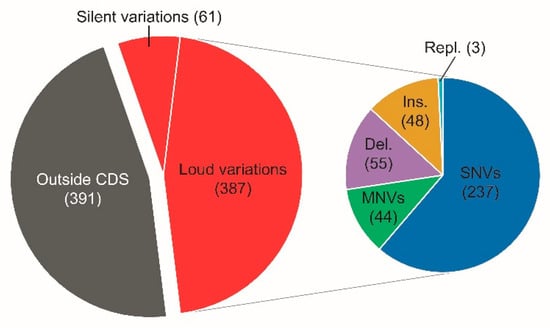 Distribution of the identified 838 variations occurring at a frequency of more than 10% in the population of CAC compared to the WT. SNVs—single nucleotide variations; MNVs—multiple nucleotide variations; Del.—deletions; Ins.—insertions: Repl.—Replacements.