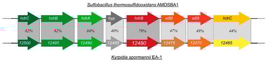 In 99.8% of the population of the CAC a variation was detected that led to the amino acid exchange V233G in CVV_12480, an annotated Fe-S binding protein in the genome of K. spormannii. The analysis of preserved protein domains revealed a potential role in energy conservation as part of the succinate dehydrogenase/fumarate reductase complex or as subunit of a CoB-CoM heterodisulfide reductase (HDR) complex (Appendix A Table A1). The HDR-complex is particularly important for methanogenic archaea as the reductase complex of the heterodisulfide CoB-S-S-CoM. However, recent studies point out that HDR-like proteins are also present in acidophilic sulfur oxidizing bacteria. Their HDR-complex seems to play a crucial role in the intracellular oxidation of protein-bound reduced sulfane–sulfur compounds (RSSnH) to sulfite [,]. Further blast analyses of the CVV_12480-surrounding genes showed high sequence identities to various genes of heterodisulfide reductase (hdr)-like complex genes of Kyrpidia tusciae and different Sulfobacillus sp., respectively (not shown). In fact, all gene-encoded proteins of the analyzed gene cluster of K. spormannii (CVV_12500-12465) have a rather high identity to the described hdr-like gene cluster of Sulfobacillus thermosulfidooxidans AMDSBA1 (Figure 5). Similar gene clusters could also be found in other acidophilic sulfur oxidizers such as Acidithiobacillus sp. or Aquifex aeolicus [,].