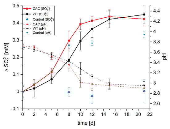 So far, the ability to oxidize sulfur species was not described for K. spormannii. Therefore, growth experiments of the wild type and CAC under lithoautotrophic growth conditions were performed using elemental sulfur (S0) as electron and energy source, CO2 as carbon source, and O2 as electron acceptor. The simultaneous accumulation of SO42−, together with a decrease in pH in the course of the experiment are evidence for the metabolic activity and growth of the wild type, as well as CAC on S0 (Figure 6). Although CAC oxidizes S0 on average faster compared to the wild type, the results are not statistically significant.