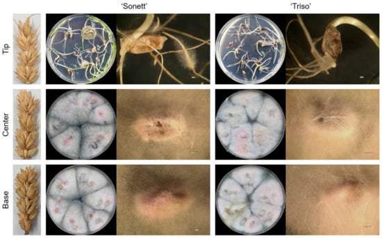 Sampling method and reisolation of Fusarium graminearum from the tips (top row), centers (middle row), and bases (bottom row) of the spikes of spring wheat varieties ‘Sonett’ and ‘Triso’ after inoculation of the central spikelets of the spike (n = 12).