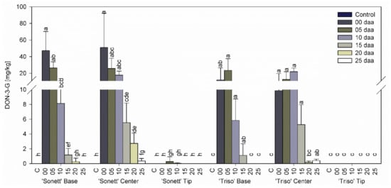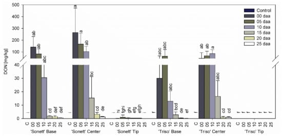 DON levels were reported for kernels below the point of inoculation in the same study but not above the point of inoculation, apparently due to the low sensitivity of the method (LOD of 20 µg/g) [35]. Similarly, many large amounts of DON were found in spikelets below than above the inoculation point in another study [38]. These results are in line with the findings of the current study (Figure 3). Apparently, transport of DON to upper parts of the spike with the transpiration stream does not significantly affect DON content in kernels (see below).