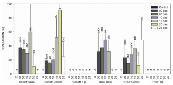 The ratio DON-3-G to DON, reflecting the detoxification activity, varied between 10 and 90% in the bases and the centers of the spikes in both varieties with a distinct trend (Figure 5). Very low levels or the absence of DON and DON-3-G in the tips of the spikes prevented the assessment of their detoxification activities.