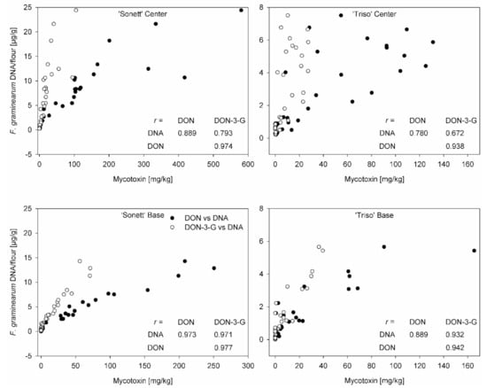 Pearson’s correlation coefficient between fungal DNA and deoxynivalenol, fungal DNA and deoxynivalenol-3-glucoside, deoxynivalenol and deoxynivalenol-3-glucoside in the bases and centers of the spikes of spring wheat varieties ‘Sonett’ and ‘Triso’ after inoculation of the central spikelets of the spike with Fusarium graminearum at different days after anthesis (daa) (p ≤ 0.0001, n = 36).