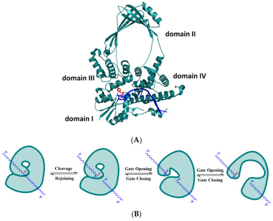 In general, all DNA topoisomerases work by binding to the target DNA molecule, cleaving one or both strands of the double helix, passing another single or double strand through the break, and resealing the DNA [21,30]. A covalent complex is transiently formed between an active tyrosine residue of the topoisomerase enzyme and one end of the broken strand during the cleavage process. [33]. The covalent complex with cleaved DNA is a vulnerable intermediate that can lead to cell death if trapped.