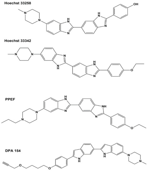 Structures of bis-benzimidazoles Hoechst 33258, Hoechst 33342, 2′-(4-ethoxyphenyl)-5-(4-propylpiperazin-1-yl)-1H,1′H-2,5′-bibenzo[d]imidazole (PPEF) and DPA 154.