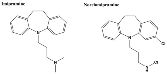 Structures of tricyclic antidepressant imipramine and metabolite norclomipramine.
